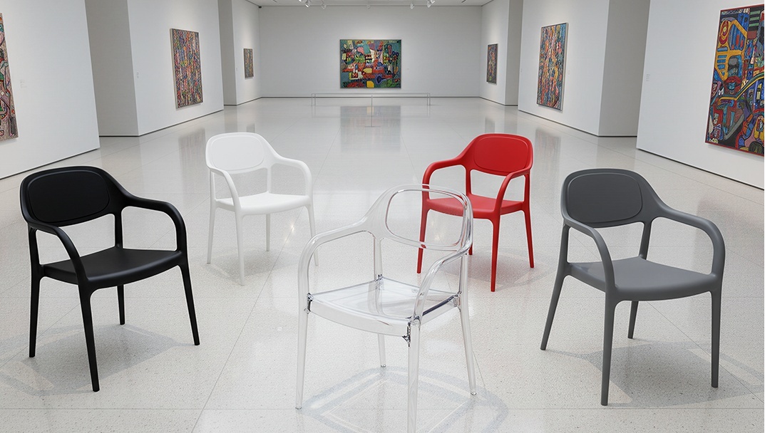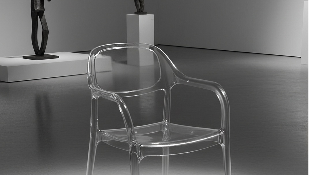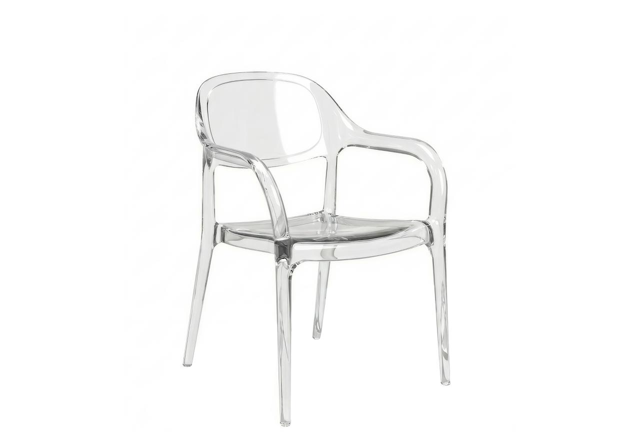 η clara είναι μια διάφανη καρέκλα εξωτερικού χώρου από ανθεκτικό πολυκαρβονικό, με καμπύλες γραμμές και ενσωματωμένα μπράτσα που προσφέρουν άνεση και μοντέρνα αισθητική.