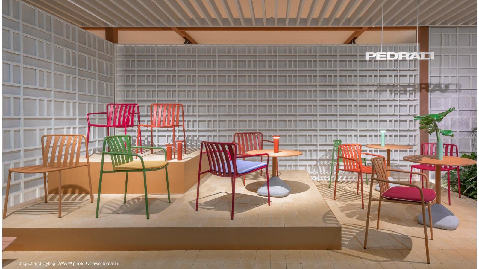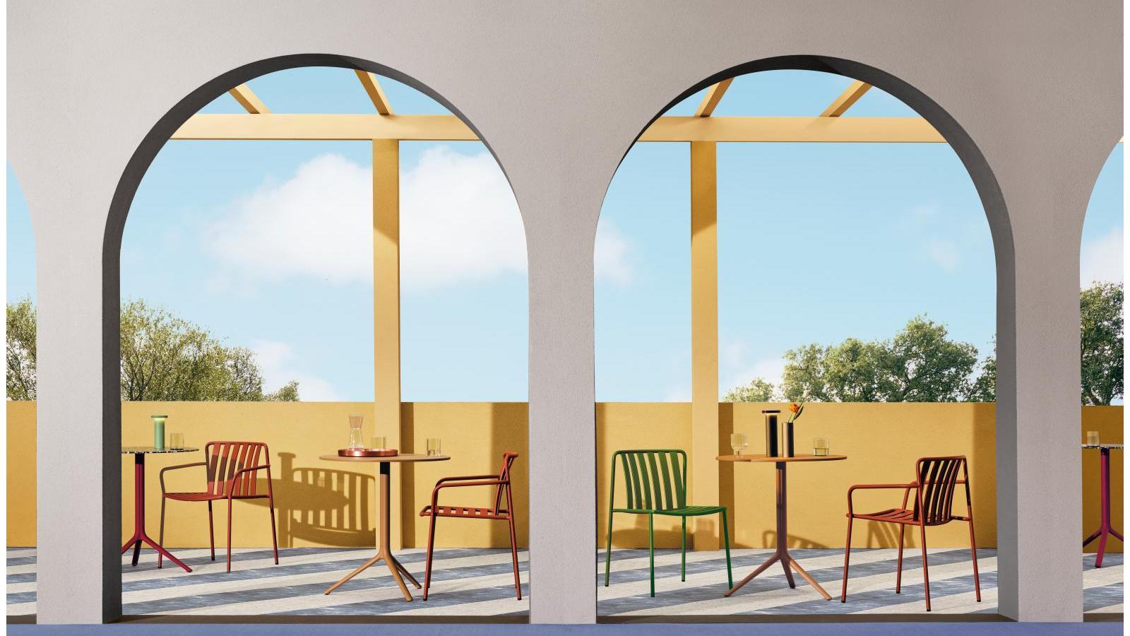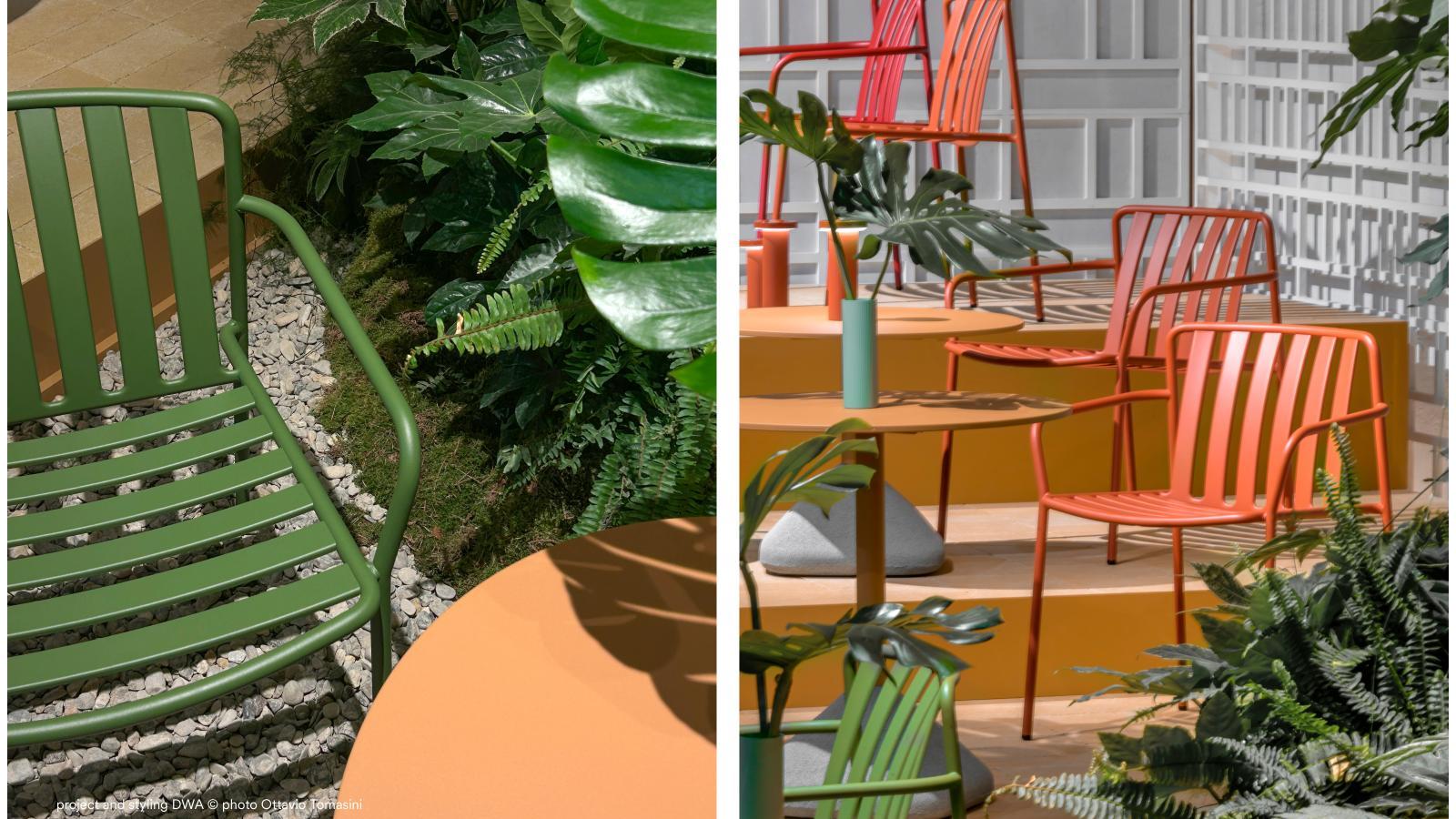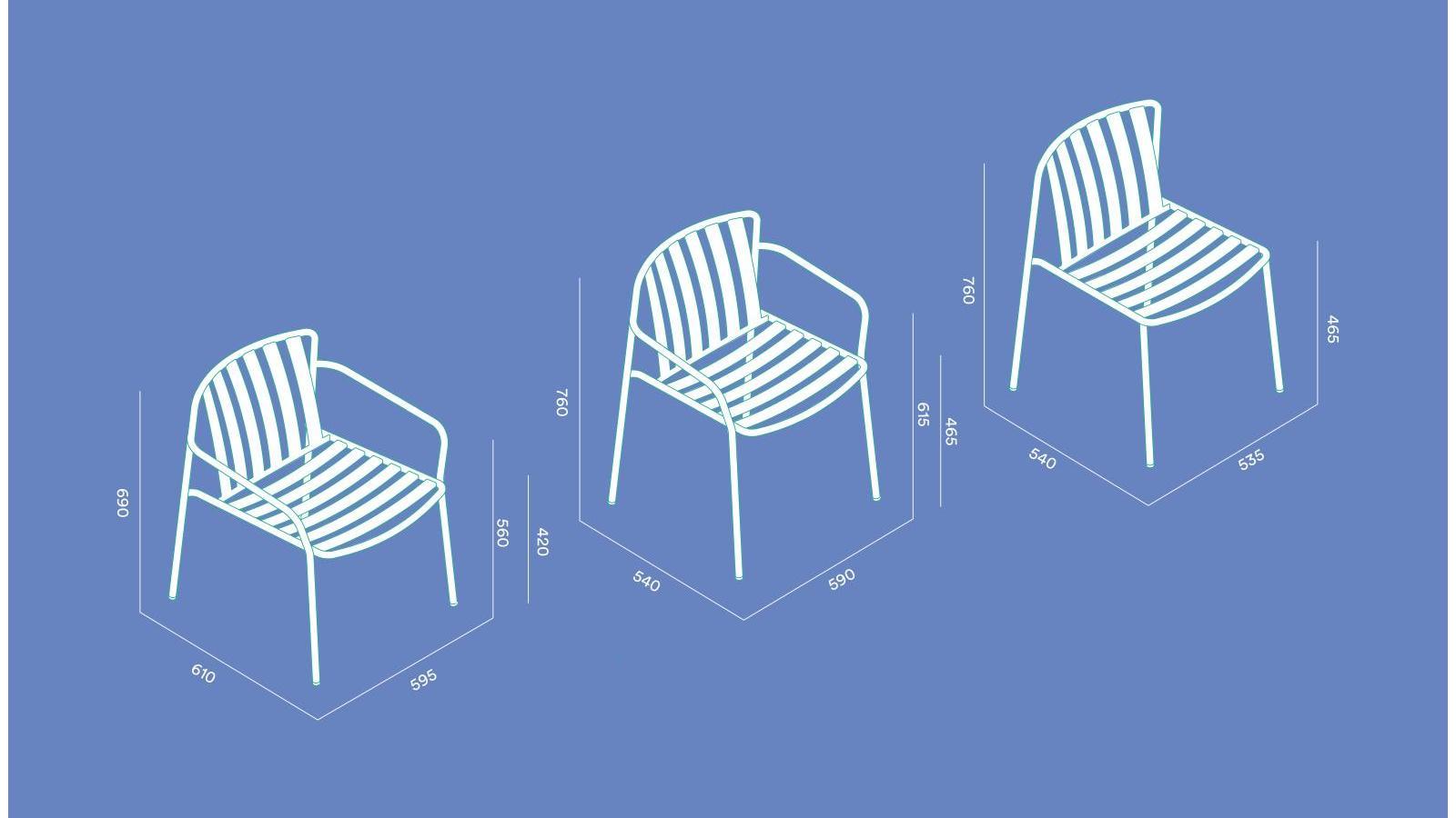 καρέκλα εξωτερικού χώρου με σκελετό από καμπυλωτό σωληνωτό ατσάλι και πλάτη/κάθισμα από διαμορφωμένο φύλλο ατσαλιού με κάθετες και οριζόντιες γραμμές. στοιβάζεται έως 6 τεμάχια και διατίθεται με ή χωρίς μπράτσα, καθώς και με προαιρετικό μαξιλάρι καθίσματος.