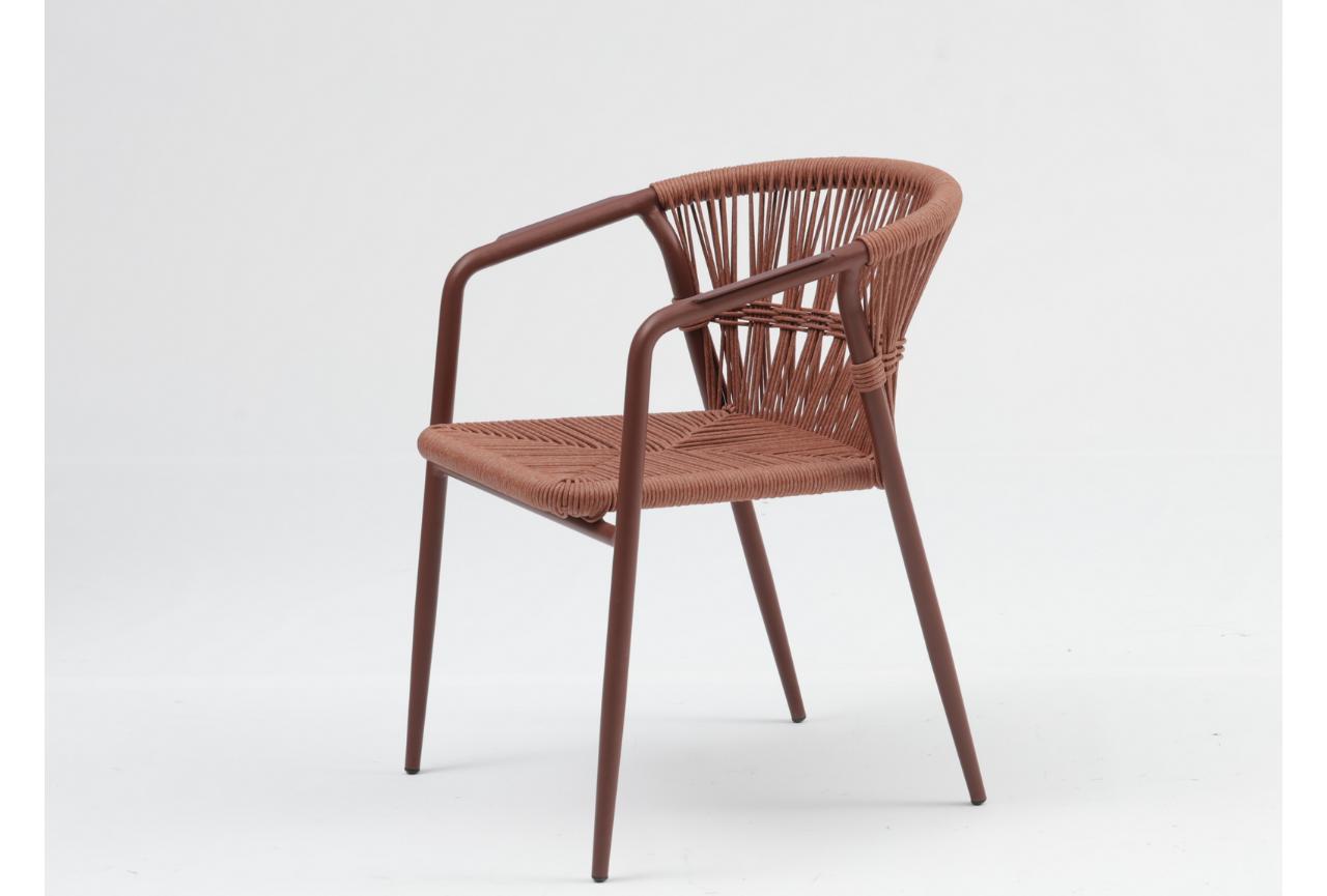 κάθισμα με ανάλαφρη, γεωμετρική γραμμή και σύγχρονη αισθητική. ο σκελετός της είναι λεπτός, κατασκευασμένος από αλουμίνιο, με τέσσερα πόδια και ενσωματωμένα μπράτσα που ακολουθούν την καμπύλη της πλάτης. η έδρα και η πλάτη αποτελούνται από σφιχτά πλεγμένο κορδόνι, τοποθετημένο σε συμμετρικό μοτίβο που προσθέτει υφή και χαρακτήρα. η πλάτη αγκαλιάζει ελαφρώς το σώμα, δημιουργώντας μια ενιαία, εργονομική φόρμα.