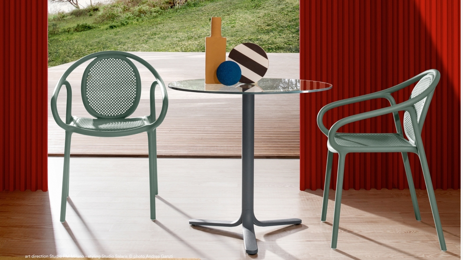 λειτουργική, πολυμορφική και σχετικά μικρή σε μέγεθος, η καρέκλα είναι κατάλληλη τόσο για εξωτερική όσο και για εσωτερική χρήση, χάρη στον συνδυασμό αρμονικών γραμμών και ενός ελαφριού αλλά στιβαρού υλικού