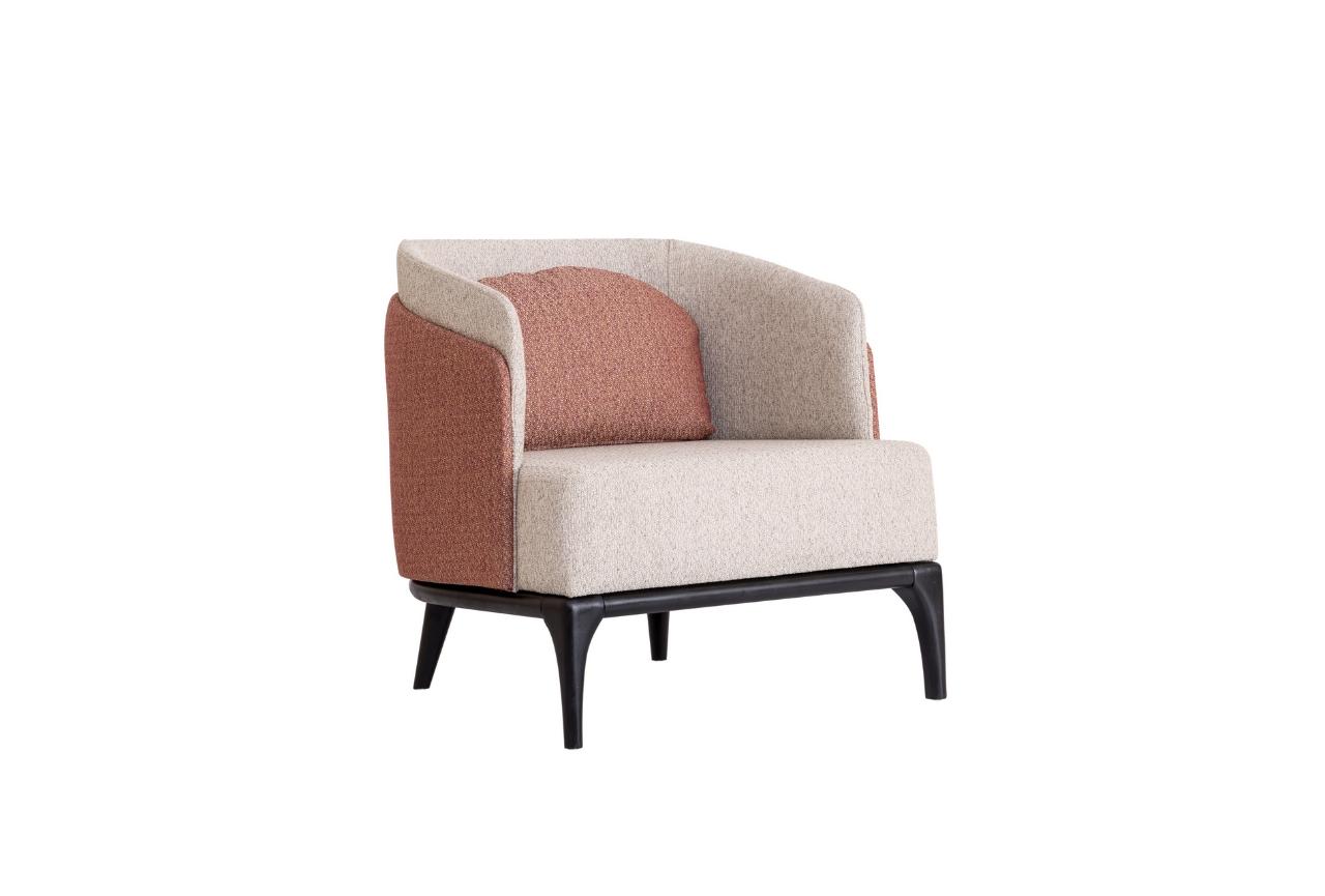 ξύλινη πολυθρόνα με μοντέρνο σχεδιασμό και επένδυση διπλής απόχρωσης.